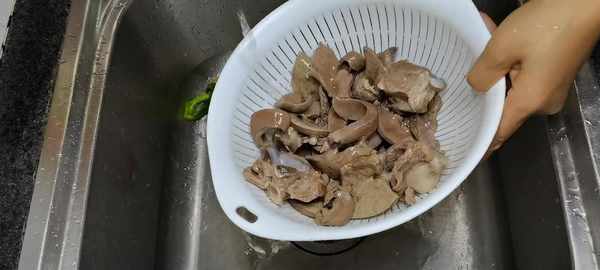 4、把鍋裡面的豬肝豬心和豬骨頭,用工具撈出來,把骨頭、豬心、豬肝用清水清洗幹凈。