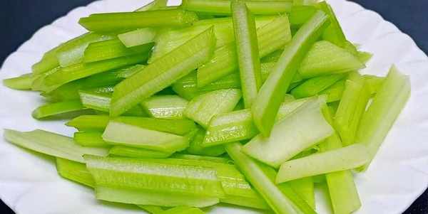 芹菜是營養成分十分豐富的蔬菜,很多人都喜歡吃,把芹菜清洗幹凈然後再用刀把芹菜從中間一分兩半,再斜刀切成五公分的長段,切好以後裝入盤中備用。