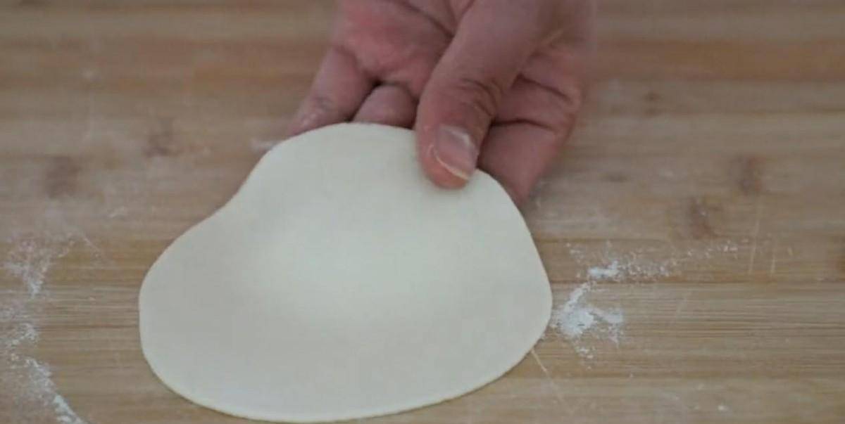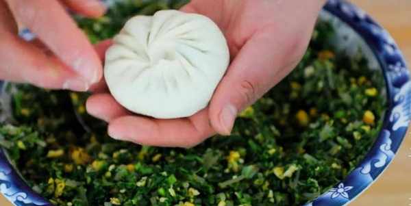 取一張面片,面片的中間放上剛才調好的餡料,像包包子一樣的先給它包起來。收口的地方捏緊