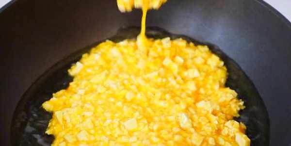 鍋熱倒入油,油熱倒入雞蛋液,用鏟子要不停的翻炒,炒制下就可以瞭,放涼備用。