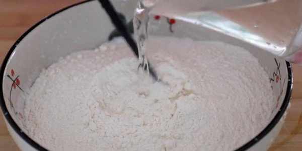 咱們現在來和面,內加入300克的面粉,先加入120毫升的開水,先用開水燙面,再加入60毫升的冷水,攪拌成大面絮,下手揉成面團,松弛五分鐘。