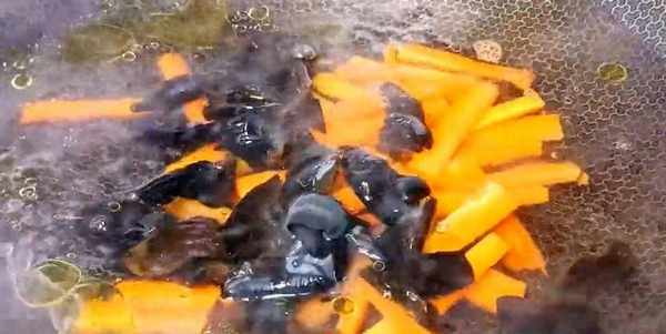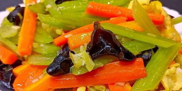 鍋中再次倒入少許底油,油熱以後放入蔥薑蒜爆香,再把我們的胡蘿卜條、黑木耳還有芹菜放進來,快速的給它翻炒均勻