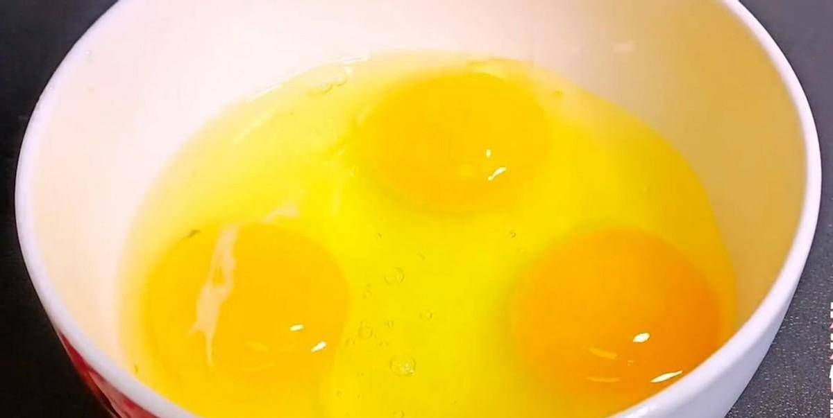 在小碗中打入三顆母雞蛋,將蛋液攪散,放一邊備用。