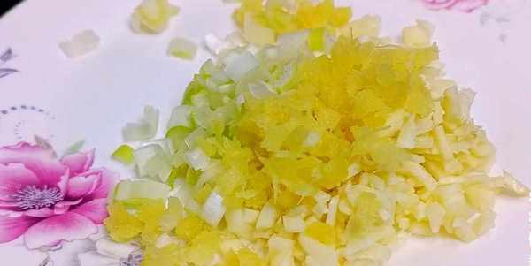 下面我們再切一些小料,大蒜剁成蒜末,生薑切成薑末,大蔥切成蔥花,全部都切好之後裝入盤中備用。