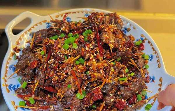 3.另起鍋熱油,下蔥薑蒜爆香,放辣椒面、幹辣椒段、白芝麻炒香,倒入炸好的牛肉,一勺芝麻醬、一勺生抽、一勺白糖、少許雞精、孜然粉、麻辣蘸料粉翻炒均勻即可出鍋。