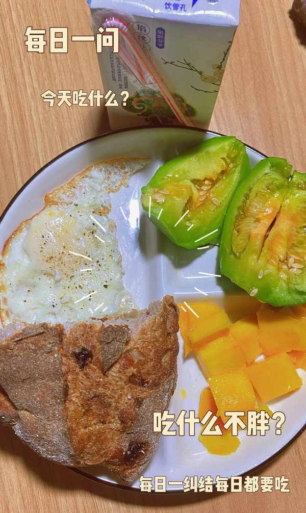 牛奶一盒、綠寶石甜瓜半個、芒果半個、荷包蛋一個、無花果全麥面包半個。