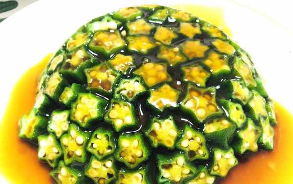 2、鍋裡倒入清水煮開,加入食鹽,下入秋葵焯水1分鐘撈出放入案板上切成薄片放入碗裡擺放整齊。