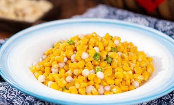 3、鍋裡倒入清水煮開,下入玉米粒,青豆焯水1分鐘撈出控幹水裝盤。