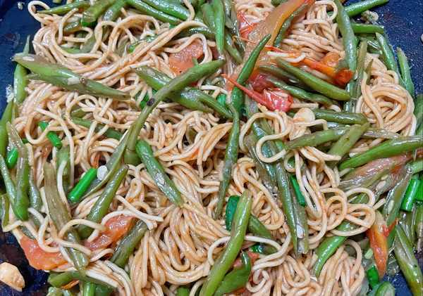 8.豆角和面條燜熟以後,用筷子翻拌均勻,撒上蔥花,再炒幾下,激發出香味,即可出鍋享用瞭。