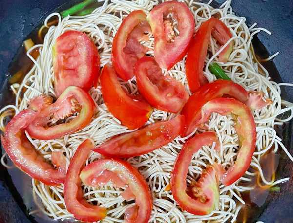 7.將面條均勻的平鋪在豆角上邊,把剛才舀出的湯汁淋在面條上,西紅柿也放在面條上邊,蓋上鍋蓋燜6分鐘。