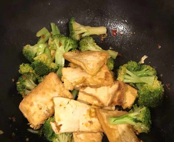 4、西蘭花炒均勻後倒入煎好的豆腐塊,放入適量鹽。(註意:老豆腐需要提前煎好,豆腐的煎法我的動態有發表過喔,可以去看看)我這裡選用的是老豆腐