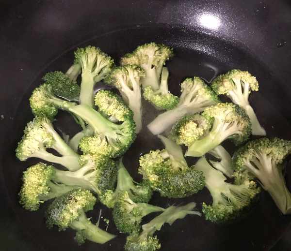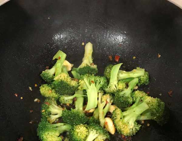 3、鍋裡油燒熱,把花椒、大蒜、豆瓣醬放鍋裡爆香,然後倒入西蘭花一起翻炒