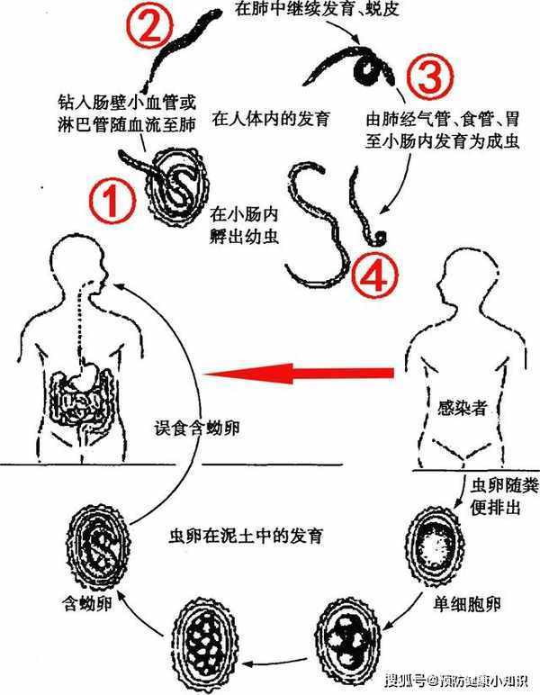 通常情况下,幼蟲會隨血流回到肺泡腔,再沿支氣管、氣管到達咽部,又重新被吞入,再重新到達小腸才逐步發育成熟為成蟲。其過程所謂一波三折。