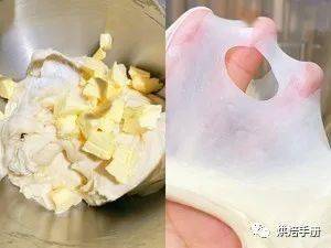 加入黃油、鹽低速檔攪拌至黃油全部吸收轉高速檔至出膜,破洞光滑即可
