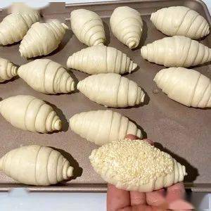 不要發太足紋路會消失,手指按面團微微回彈即可,表面沾白芝麻裝飾再噴水,烤箱自帶蒸汽的忽略放入預熱好的烤箱,蒸汽烤箱進爐時可打10秒蒸汽,中間上色滿意後可加錫紙,出爐震盤
