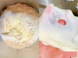 面團材料除黃油、鹽之外的東西全部加入打面缸~ 低速攪拌成團,轉高速檔至能拉出粗膜破洞有鋸齒狀