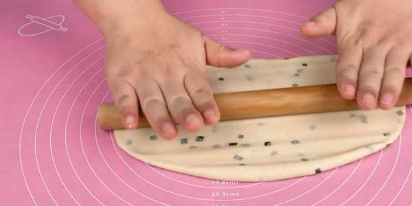 5.松弛好的面團我們移到揉面墊上,用搟面杖將面團搟得薄一些越薄越好。