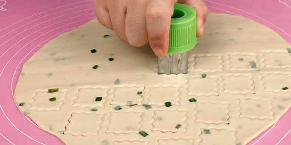 6.我們再取一個模具,用模具按壓出餅幹的形狀,多餘的餅皮部分再輕輕地撕開這個動作要輕一些,以防撕破瞭。