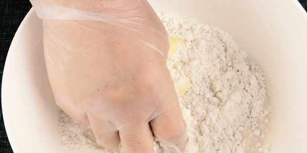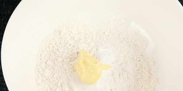 2.碗中加入約150克的低筋面粉,加入約1克的小蘇打,加入2克的食用鹽,加入20克的黃油。