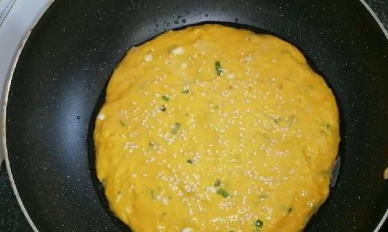 7、平底鍋先不要開火,刷入少許油,倒入面糊,準備一個勺子,底部抹上一點油,把表面鋪平整。再撒上一點芝麻,這樣吃起來更香。