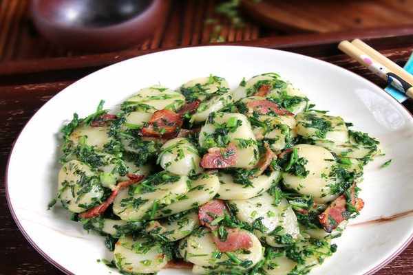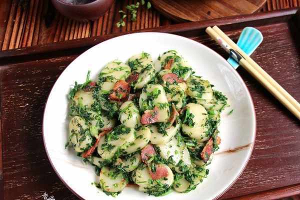 詳細做法請往下看;需要的食材‘年糕200克、薺菜100克、培根2片、橄欖油2湯匙、鹽少許。