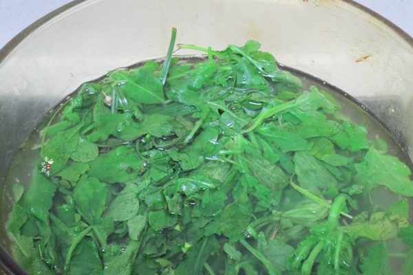 3.再把薺菜往沸水裡燙至變色後立即撈起用冷水沖涼後擠幹水分。