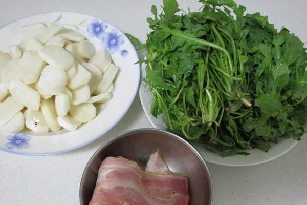 1.提前把年糕從冰箱裡取出回軟,備好培根,薺菜擇洗幹凈後瀝幹水分。