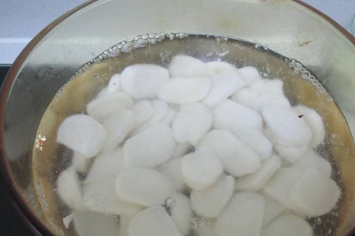 2.湯鍋裡註入清水大火燒開後把年糕入鍋燙至變軟後再用流動水沖洗一遍,以免黏連。