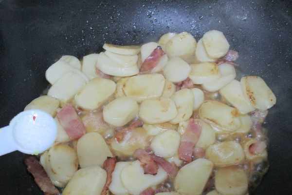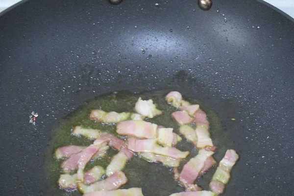 5.炒年糕最好用不粘鍋,能避免炒制過程沾底,熱鍋倒入橄欖油,溫油先把培根入鍋煸炒至出香味。