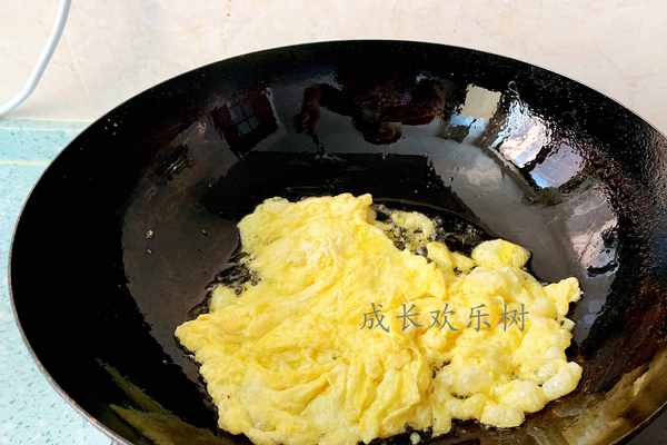2、先來炒雞蛋:兩個雞蛋加水、加料酒、一點點的鹽,打散,油燒熱,倒入雞蛋筷子滑炒(雞蛋加料酒沒有腥味,加水雞蛋可以更嫩,雞蛋入鍋,用筷子滑炒,成熟速度快,而且雞蛋更嫩);