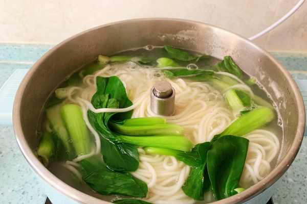 5、炒菜的同時,我們煮面:煮面水量大,第一遍開鍋後,繼續加水煮,這個時候不用蓋鍋蓋,這樣煮出來的面更筋道,記得最後下綠菜,不要煮的時間太長,防止綠菜變黃。