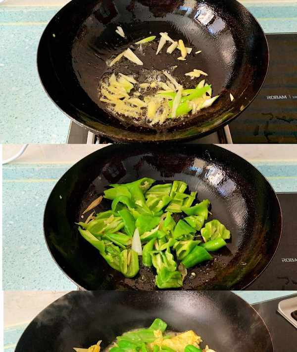 3、接著炒青椒雞蛋:爆香蔥薑,下青椒塊,快速翻炒,鍋特別幹的時候,淋入一點點清水,快速蒸發的水蒸氣,縮短青椒的成熟時間,而且炒好之後沒有辣味;青椒8分熟,加入一點點食鹽,倒入一半的雞蛋,翻炒均勻出鍋。