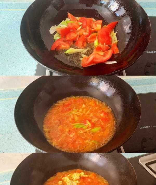 4、最後就是炒西紅柿雞蛋:西紅柿切塊,爆香大蔥,下西紅柿,加鹽,一邊炒一邊壓,炒到西紅柿軟爛,加水,煮開,轉小火燉一會,這時候可以加點糖提鮮,西紅柿黏稠之後,倒入雞蛋,翻勻關火。