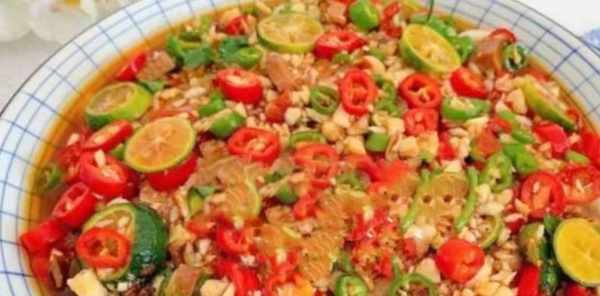 2、碗中加入青紅辣椒圈,蒜末,青檬片生抽1勺,鹽1小勺,糖適量,蠔油1勺,1大勺糟辣醬,淋入熱油,攪拌均勻。