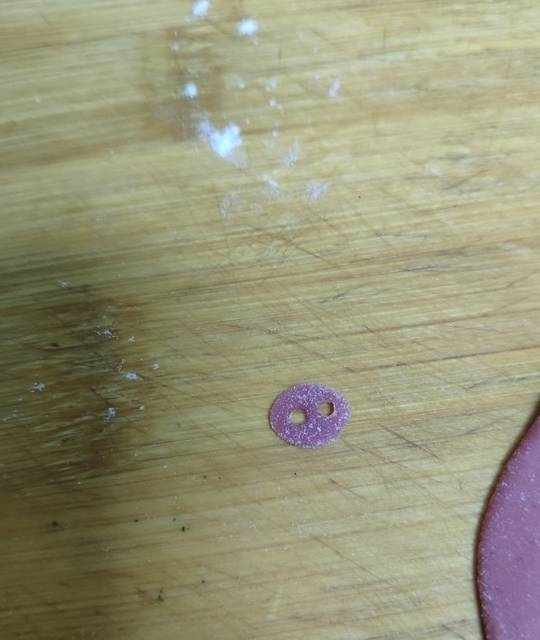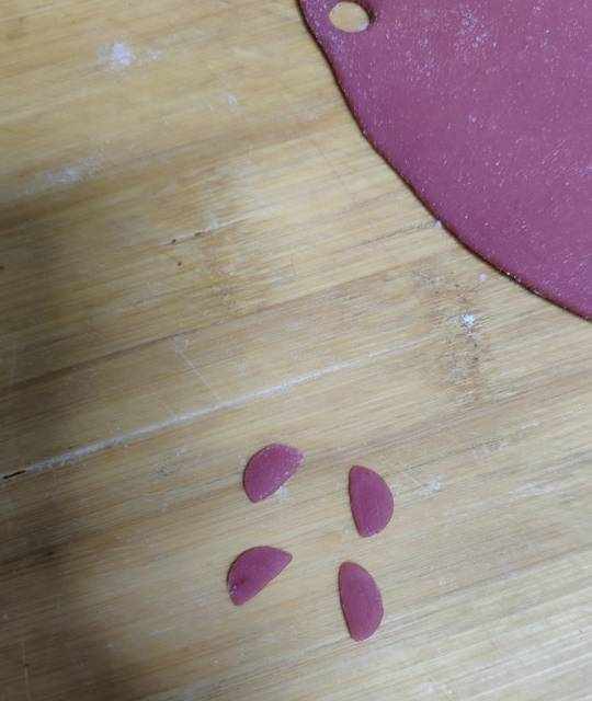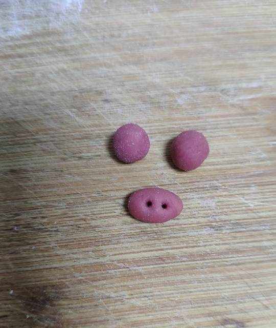 8.紅色面團搟開,用裱花嘴壓出圓形,稍微往兩邊抻一抻成橢圓形,中間在用細口裱花嘴刻出鼻孔,一個豬鼻子就做好瞭。