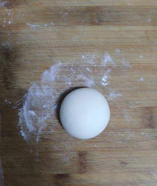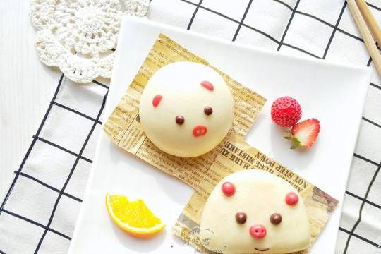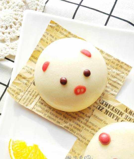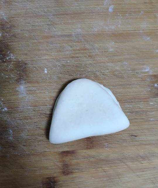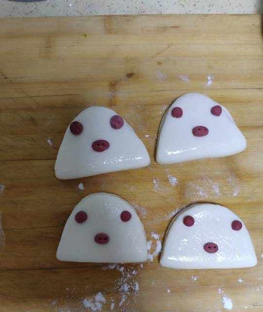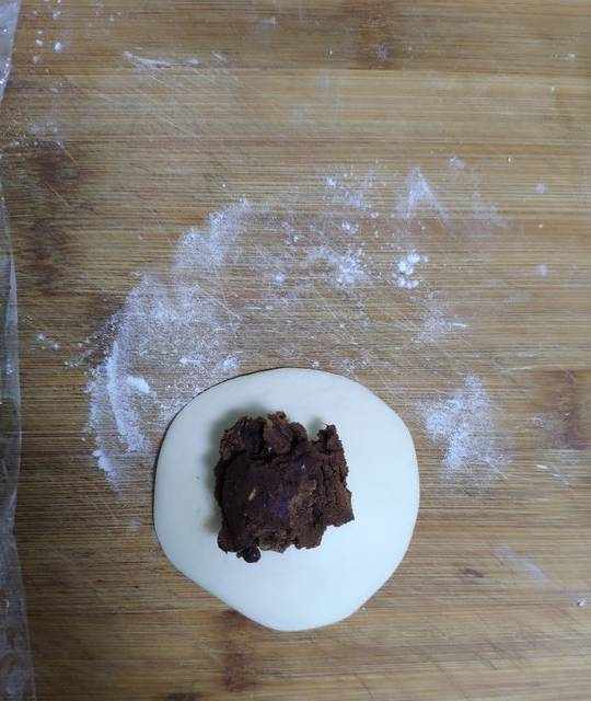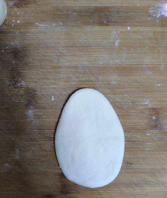 6.先做圓形“豬式”小吃。拿一白色面團,搟開放入豆沙餡
