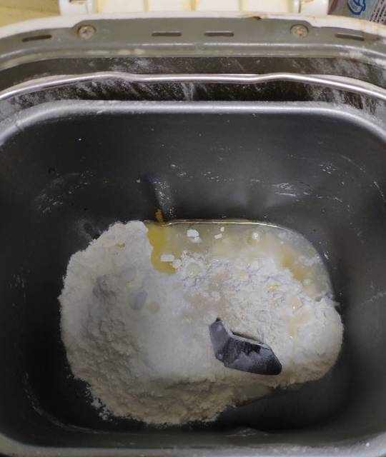 1.面粉放入面包桶中,加入酵母、泡打粉、白糖和玉米油,根據面粉的吸水性適量添加清水,開始和面程序。