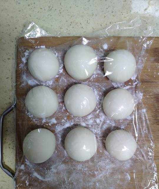 3.分成大小均勻的9份。(其中1份面團用來染色,剩下的8個做兩種造型的“豬式”小吃)