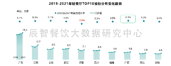以省市分佈來看,廣東省的輕餐廳門店最多,2021年達到19.4萬傢。從近2年復合增長率表現來看,廣西、山東增幅較高,達6.1%。