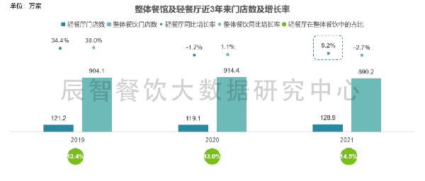 2021年底,餐飲整體規模跌破900萬傢,跌幅2.7%,達到近3年來新低。而輕餐廳逆勢增長,門店數達到128.9萬傢,同比漲幅達8.2%。2021年,輕餐廳在整體餐飲中占比也再度提升1.5%,達到14.5%,其重要性進一步提升。