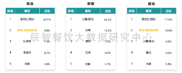 辰智數據顯示,液態乳/奶粉和熱帶/亞熱帶水果類食材在輕餐廳中較廣泛應用。輕食類菜品流行趨勢向來迭代頻繁,即使是已經廣為人知的普通食材,也有“翻紅”的可能。例如2022年底口罩政策放開,消費者對“維C”需求強烈,讓檸檬、柑橘類飲品供不應求。另一方面,對小眾食材進行深度挖掘,也有誕生爆品的機會。
