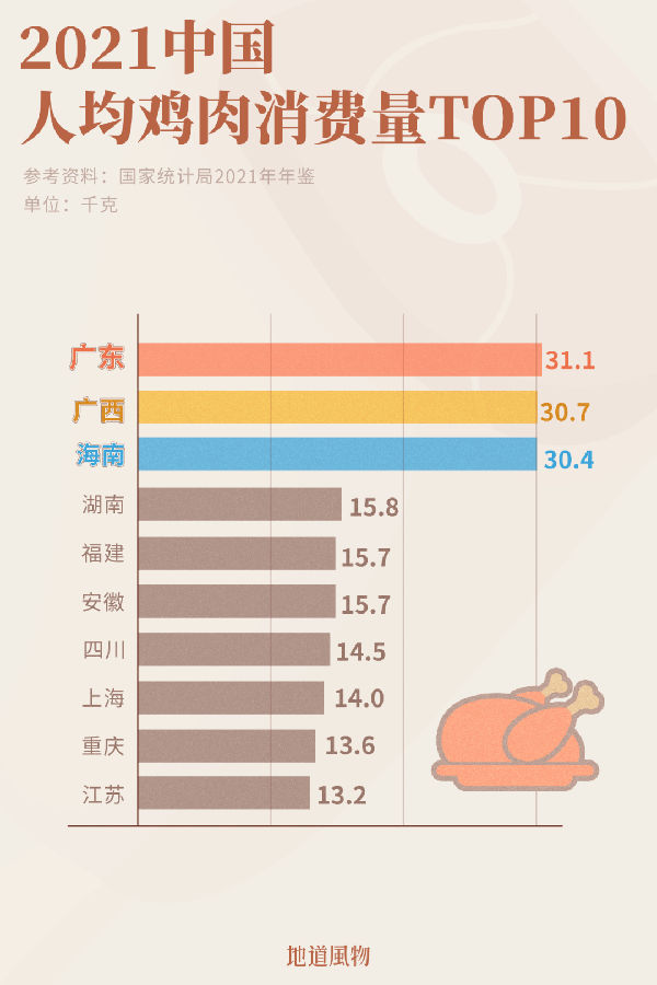 不同於對北方“大碗喝酒、大塊吃肉”的豪爽想象,中國吃雞大省主要分佈在南方。其中最醒目的,是2021年全國各省人均雞肉消費榜單的前三位置。廣東、廣西、海南這華南三兄弟,包攬瞭中國吃雞榜的冠亞季軍,而且人均消費量,幾乎是第四名湖南的2倍。