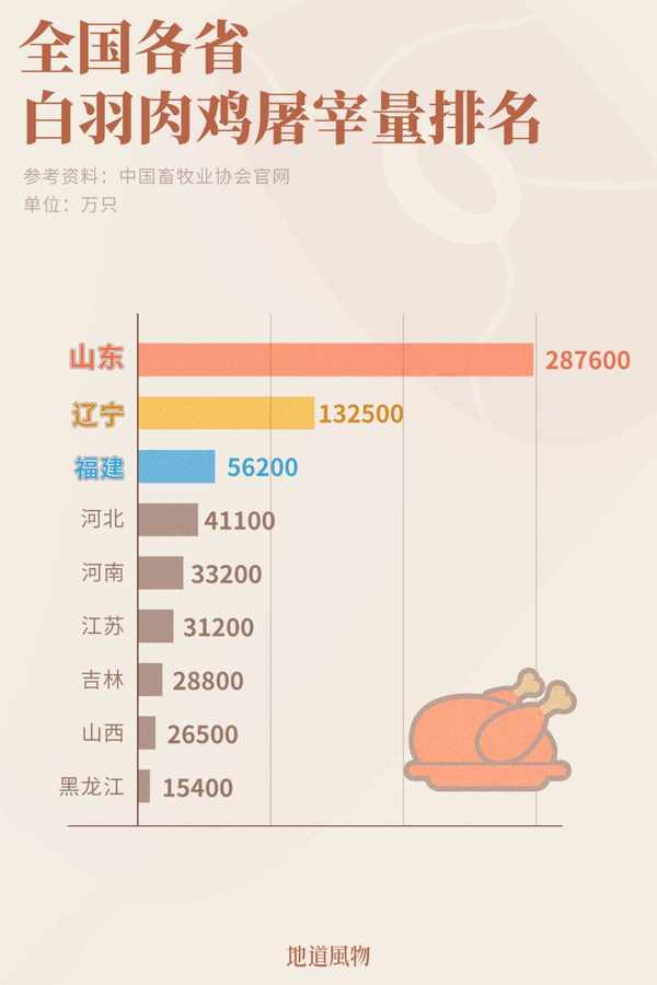 在人均雞肉消費量上,北方遠不及南方。但從雞肉產量上來看,北方人對雞的熱情可是絲毫不少。根據中國畜牧業協會統計的數據,中國白羽雞屠宰量上山東與遼寧分列冠亞軍,僅山東一省年均出欄商品肉雞就占全國的41%之多。