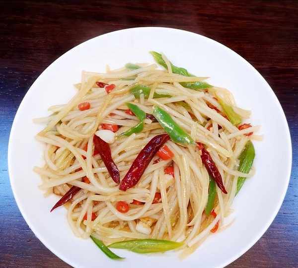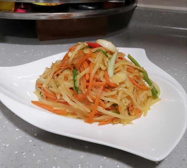 把土豆切成絲,如果刀工不好的話,市面上有很多刮絲的小工具,土豆絲要浸泡在冷水裡,可以去掉多餘的淀粉,吃起來更清脆。鍋中燒水焯四十秒土豆絲,也可以不焯水直接爆炒,熱鍋中爆香一點幹辣椒蒜片等等,放入土豆絲翻炒,加入自己喜歡的配料,一定要記得加白醋比陳醋更爽口,翻炒均勻後一盤色香味俱全的酸辣土豆絲就做好瞭。
