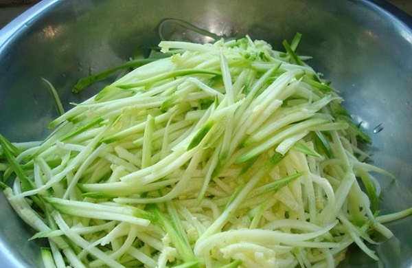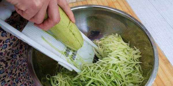 3.新鮮的西葫蘆兩個去掉頭部和根部,放在清水中給它沖洗幹凈,然後把西葫蘆放在擦絲器上給它擦成細絲。往裡面加入三克精鹽用手抓拌均勻。醃制五分鐘備用。