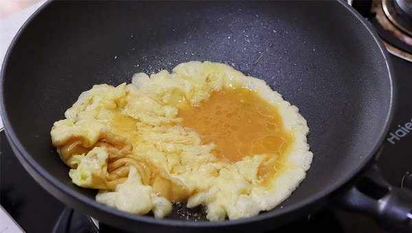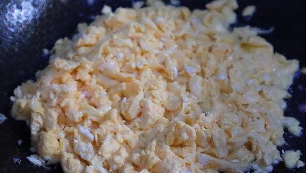 2.準備新鮮的母雞蛋六個打入碗中,然後在裡面加入少許的精鹽調味,用筷子攪拌均勻。炒鍋內加入適量的寬油,油溫燒至冒煙,把它倒出來,然後在裡面加入適量的涼油,把準備好的雞蛋加出來。快速地炒香炒熟炒散放入案板上放涼備用。