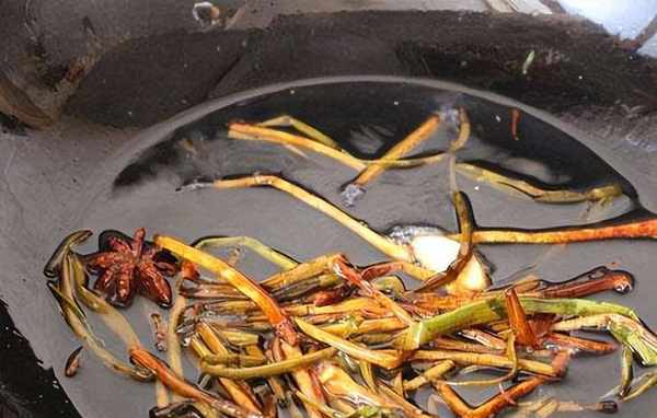 4.炒鍋燒熱放入涼油,把準備好的蔥花、薑片、八角、桂皮、香葉、花椒放進來。用大火炸香。把配料炸幹之後用漏勺把它打撈出來。