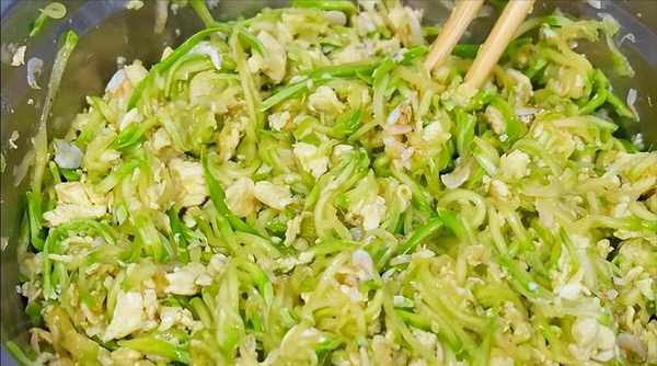 5.醃著好的西葫蘆用手攥幹水分,然後放在案板上給它隨意的切兩下。把炸好的蔥油直接澆在西葫蘆上面,這一步是鎖住西葫蘆裡面的水分,把準備好的雞蛋加進來。碗裡面加入精鹽、十三香、餃子料調味。攪拌均勻就可以包啦!