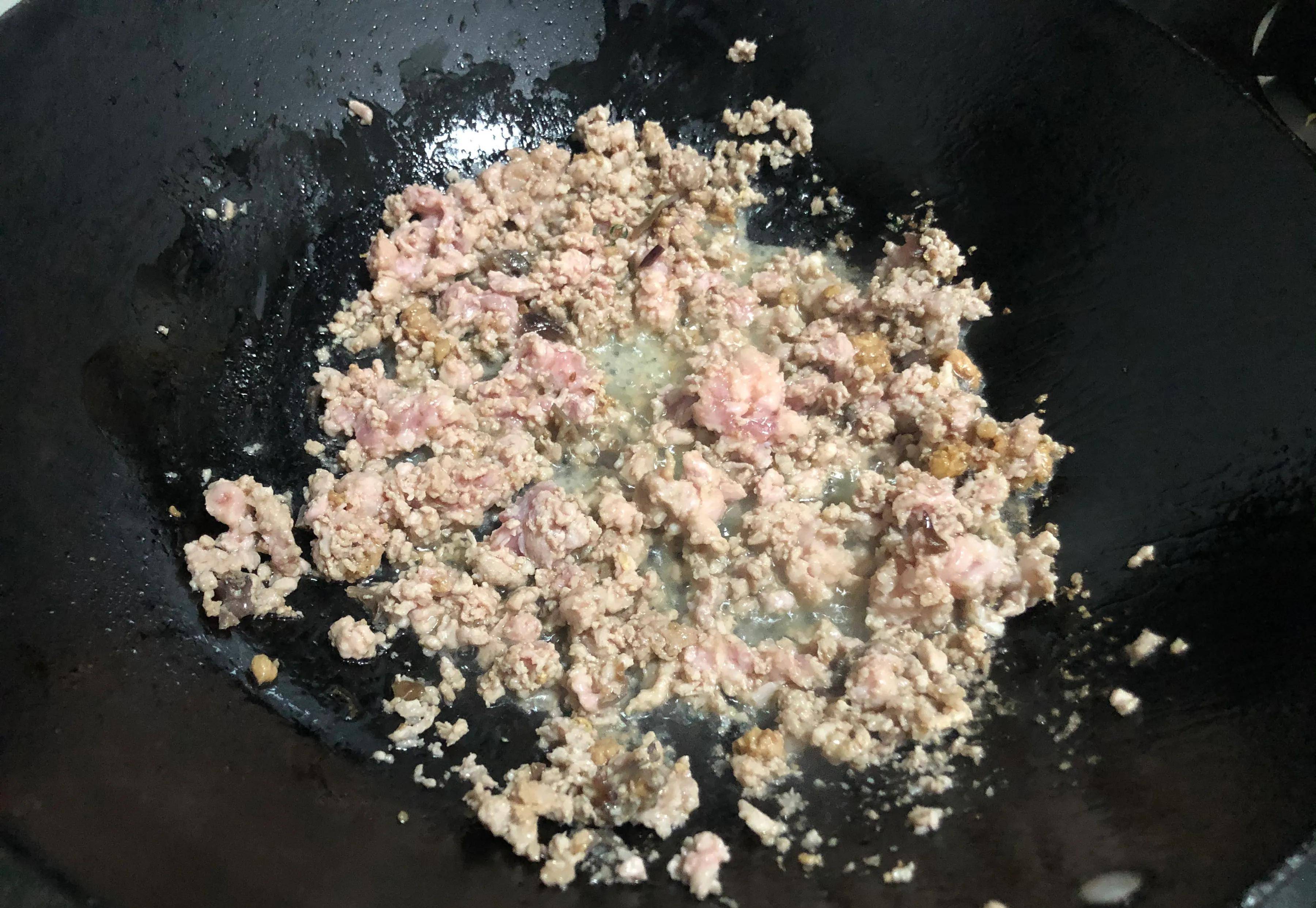 (4)鍋中倒油,放入肉末炒熟,然後加2碗開水煮沸,放鹽雞精調味