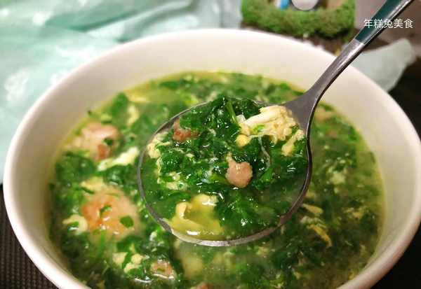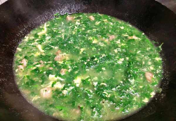 (5)緊接著倒入薺菜碎再次將水燒開,然後倒入淀粉水勾芡
